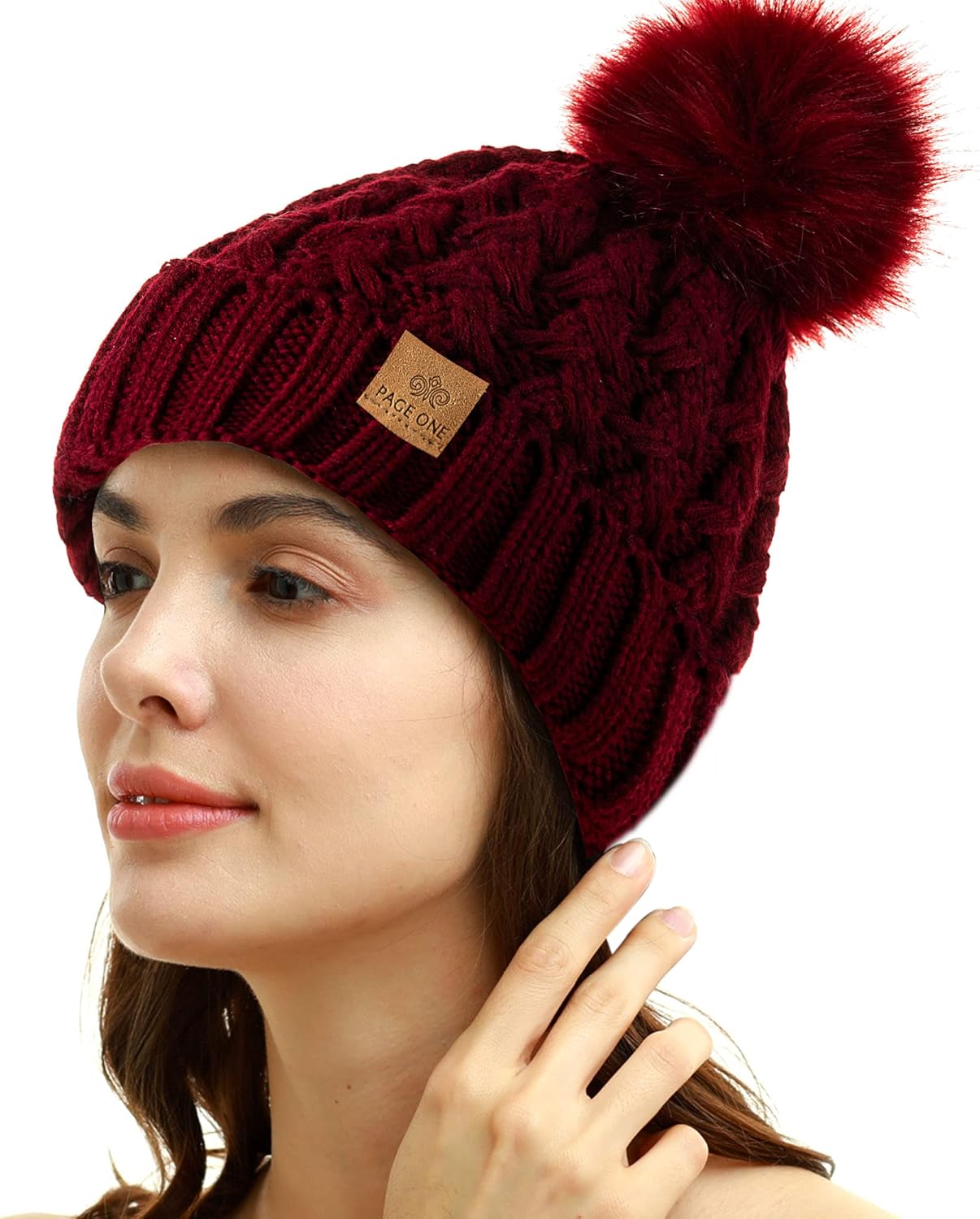 PAGE ONE Womens Winter Ribbed Beanie Crossed Cap Chunky Cable Knit Pompom Soft Warm Hat