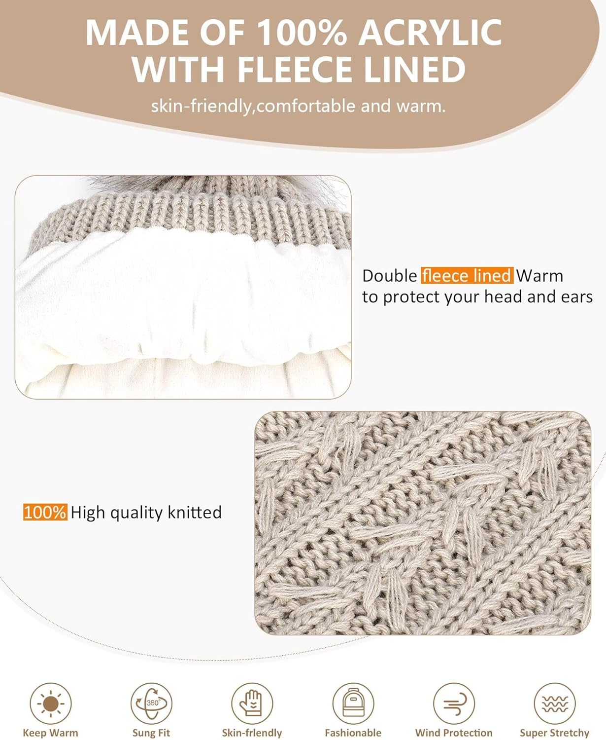 Womens Beanie Hat Scarf Gloves Set, Fleece Lined Winter Hat with Pom Pom, Long Knit Scarf Touchscreen Gloves for Cold Weather